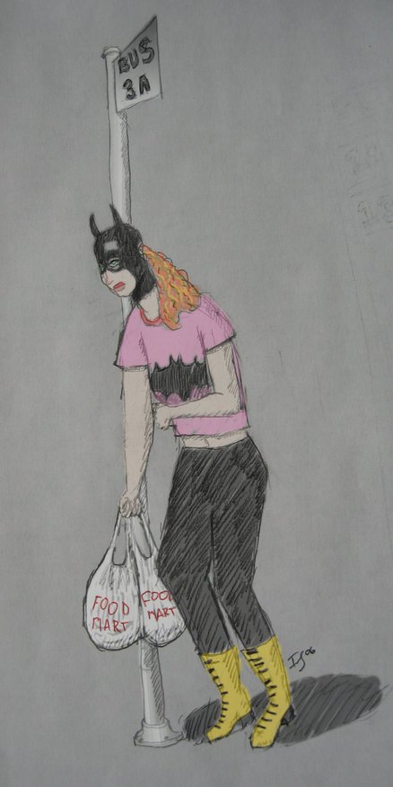 Batgirl just wants to get home and relax After looking at about 400 different Batgirls, there was pretty much no way I could not also draw a Batgirl. Only, I'm not too much of an artist, as my prolific output here on dangerpants.com can easily attest. Oh well. It was fun, and it got me off my (artistic) butt. No apologies for the low quality of the drawing, that was part of the point -- draw it up and get it posted. The drawing was done with mechanical pencil on from-the-recycling printer paper (bonus trivia: covered with raw Postscript on the other side!). It was "scanned" via digital camera, and cropped and colored in The GIMP. - Ian Johnston (reaper [at] obairlann [point] net) |